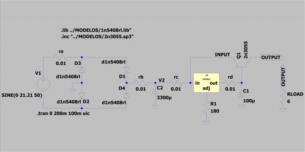 Si nos fijamos, el transistor 2N3055 se ha añadido para que soporte la corriente de la carga, en lugar de usar al regulador 7812 para tal fin. En este diseño usamos al regulador como referencia de tensión, no para entregar corriente.