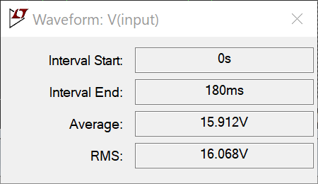 Como dato anecdótico, vamos a calcular a la cuenta de la vieja la tensión promedio. Si añadimos un par de marcadores en el máximo y mínimo de la tensión V2, tendremos los siguientes valores: