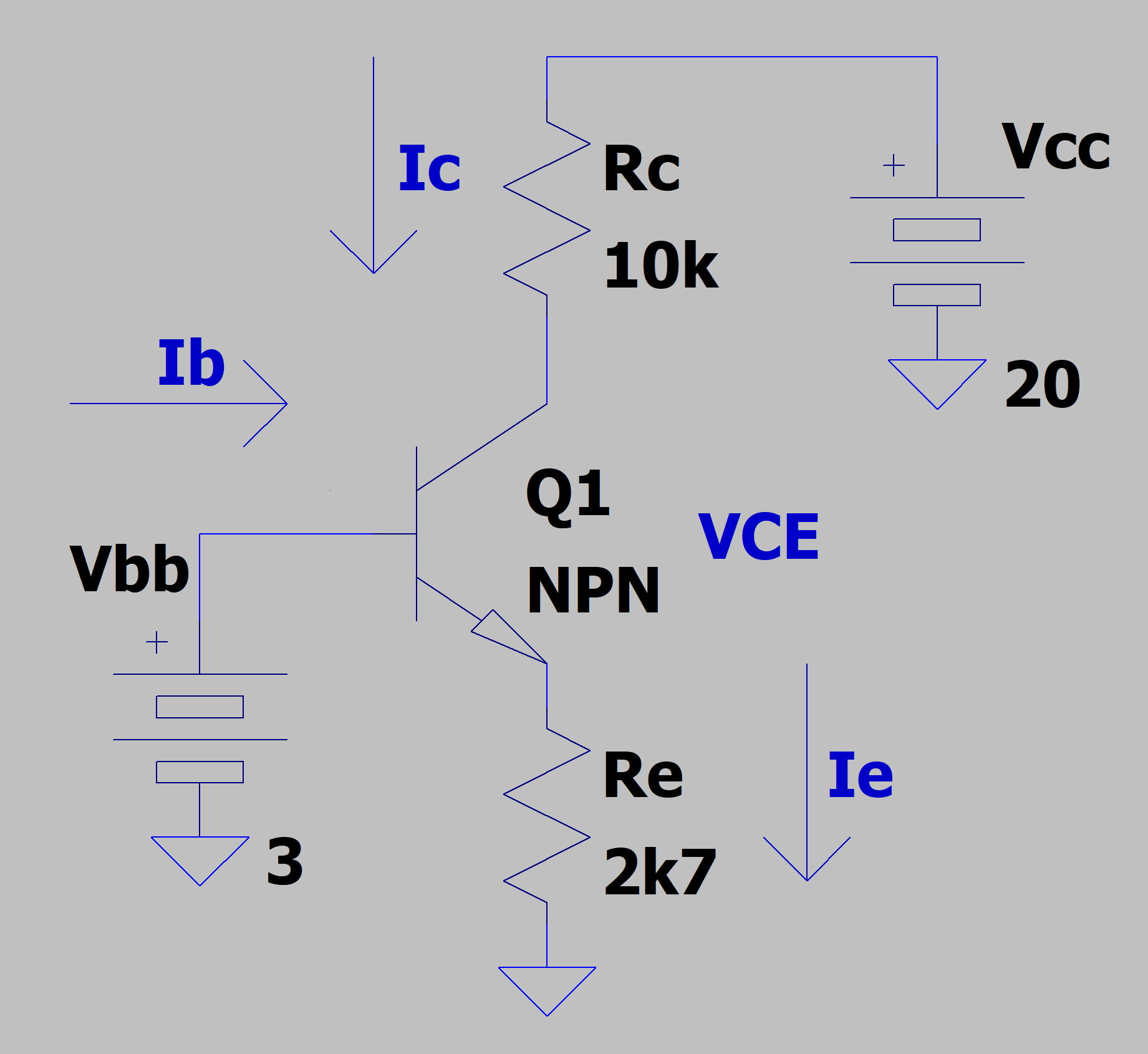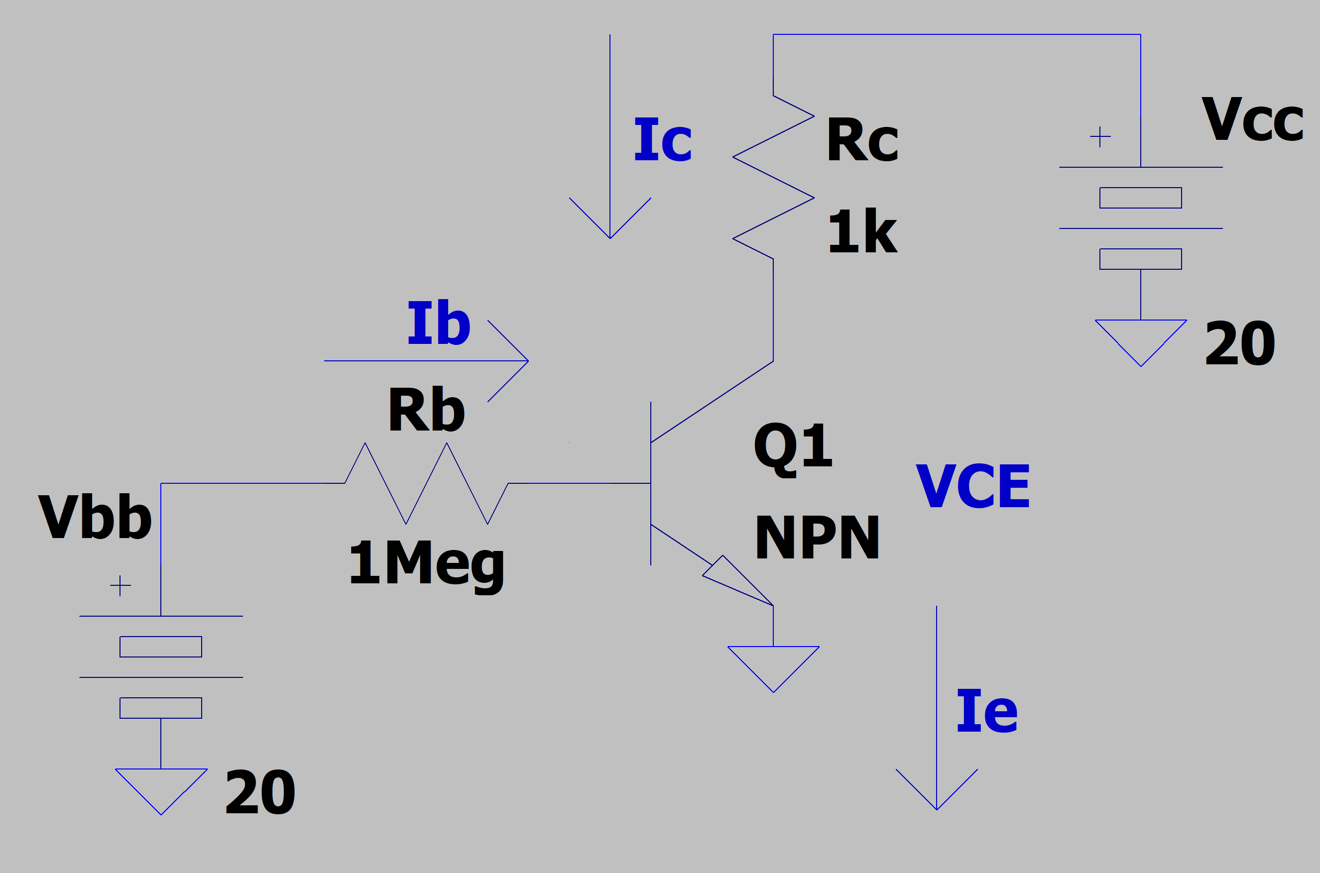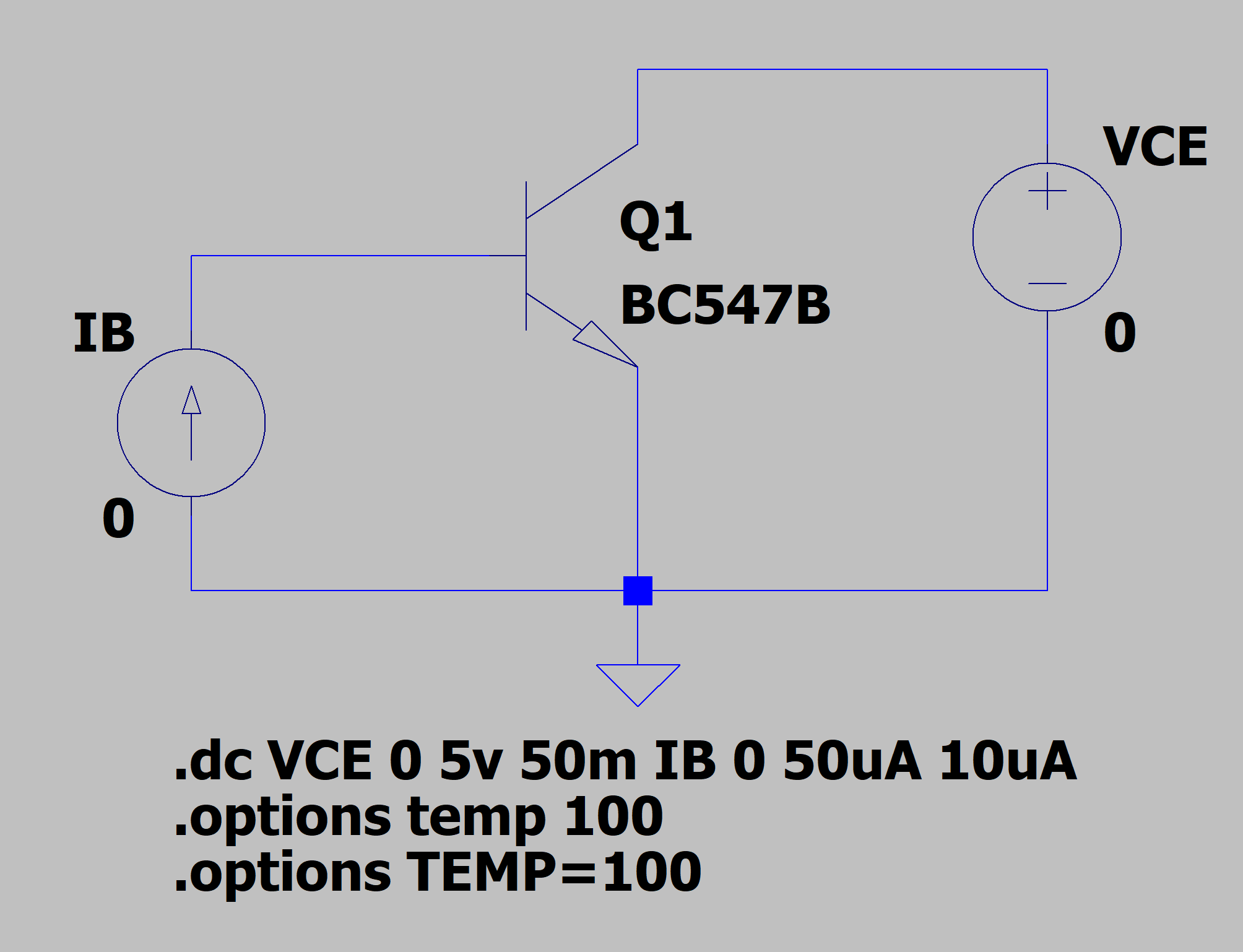 Antes de ver dicha recta, veamos antes lo que son las curvas de colector-emisor. Ya que en este blog se toca mucho el tema de la simulación electrónica, las vamos a generar mediante LTspice, en lugar de dibujarlas a mano. Veamos el siguiente esquema: