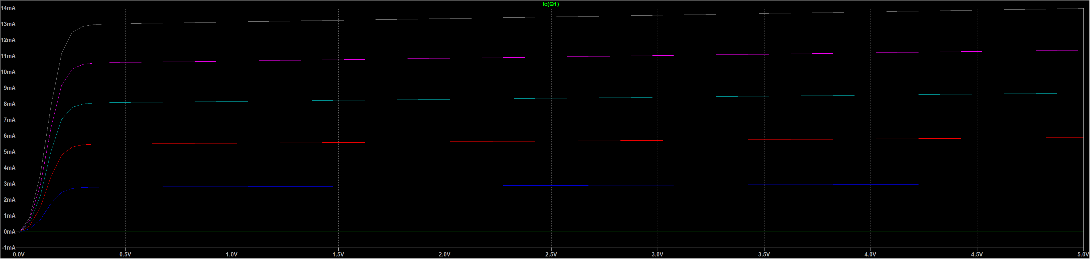 En este circuito hacemos un barrido de corrientes de base, de 0 a 50 micro-amperios (en saltos de 10) y de tensiones de VCE, de 0 a 5 voltios (en saltos de 5).