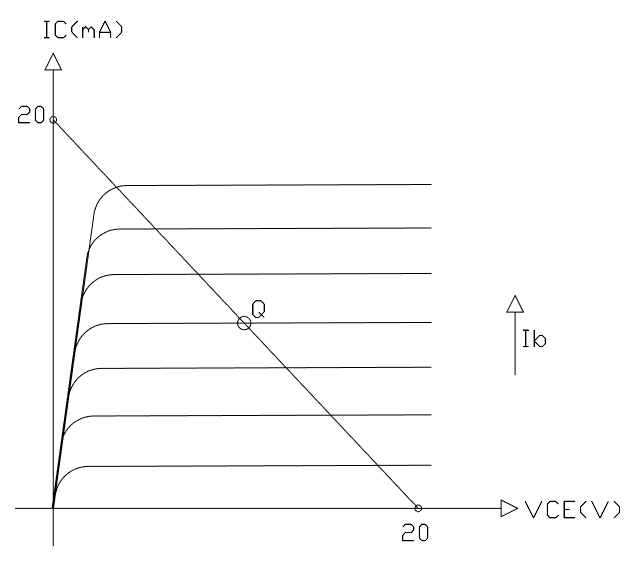 La recta de carga es la linea que une los puntos Ic = 20 mA y VCE = 20 voltios.