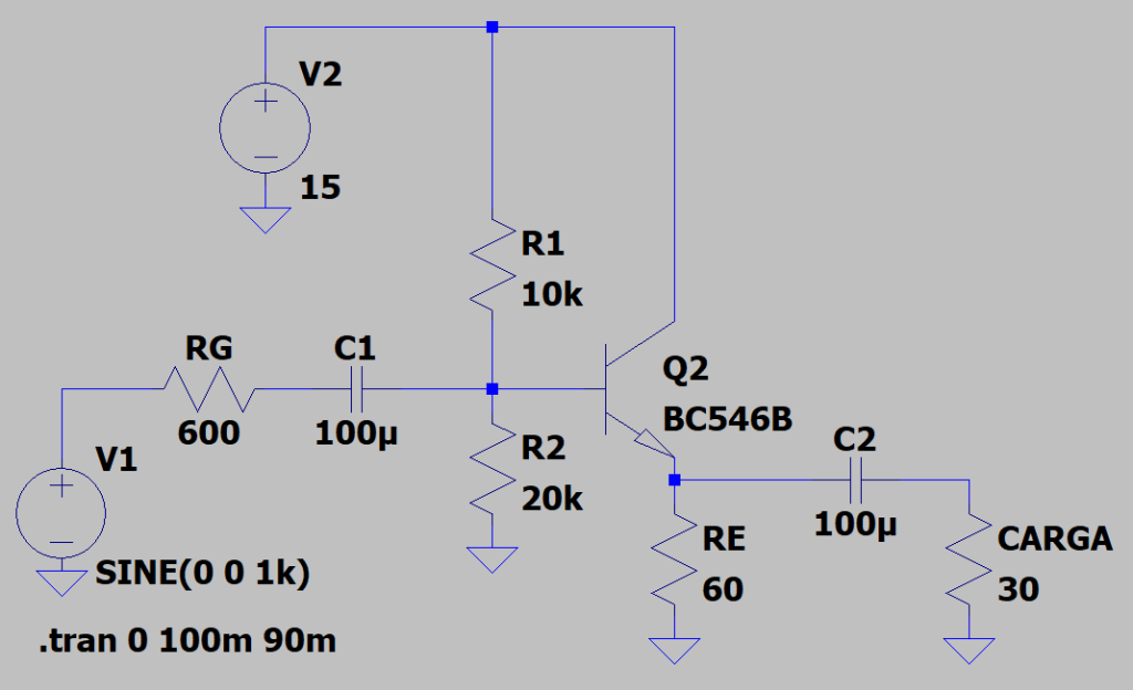 Un circuito con polarización en colector común.