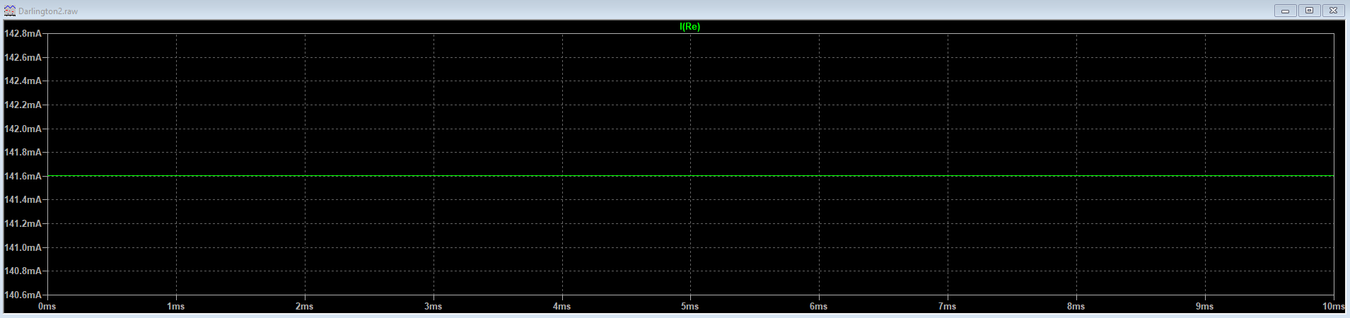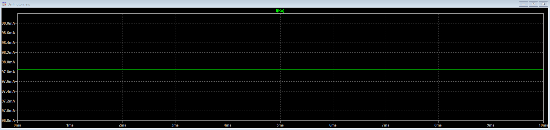 Vemos que la corriente es bastante menor que la teórica (cerca de 98 mili-amperios). La razón es que la corriente de base del transistor es la de emisor dividida entre la hFE, y esta es lo suficientemente grande como para que la tensión en el divisor de tensión caiga de los teóricos 10 voltios hasta los 6.68 voltios que arroja el simulador.