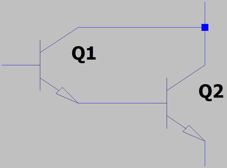 Vamos a añadir un segundo transistor en una configuración que se llama Darlington. La característica fundamental de esta configuración es que la beta total es el producto de las dos de cada transistor. Véase la siguiente imagen en la que aparecen dos transistores en darlington: