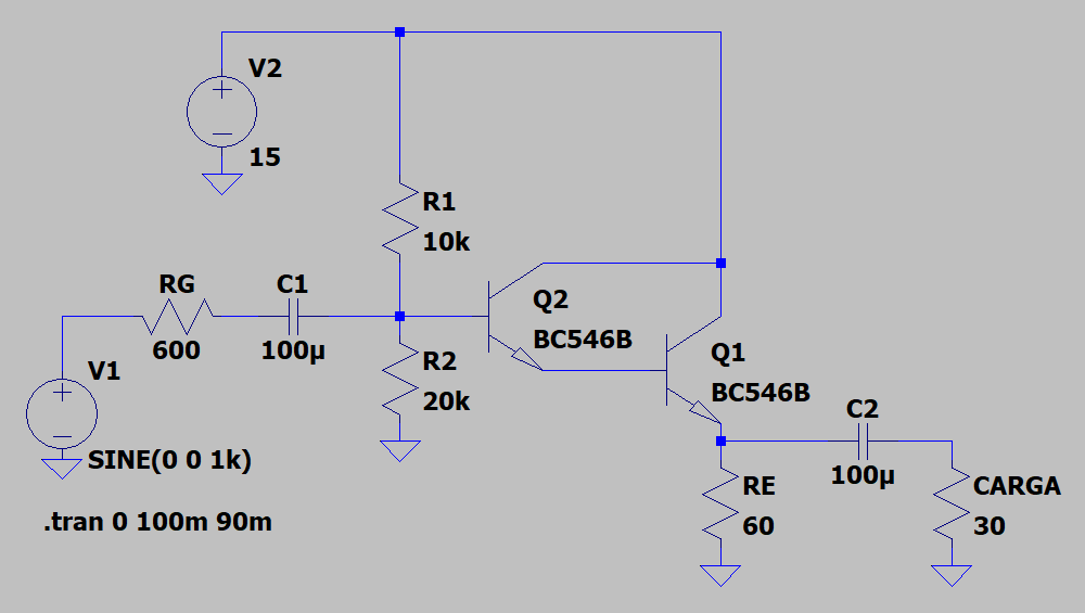 Simulemos el circuito para ver si realmente circula esta corriente por RE: