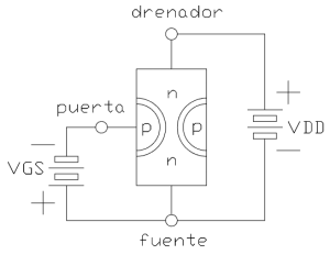 Como podemos ver, al polarizar negativamente la puerta con respecto a la fuente, aparecen unas zonas (llamadas de deplexión), que obstaculizan el paso de la corriente de drenador a fuente. Es decir, mediante la puerta controlamos el flujo de corriente de drenador-fuente (tensión VGS).