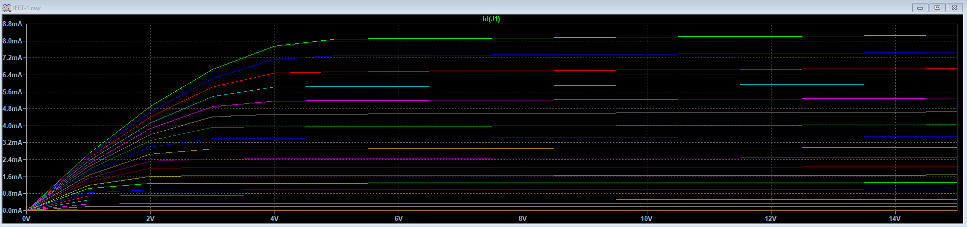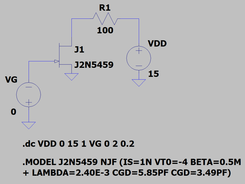 Como veremos en la siguiente simulación, vamos a hacer dos barridos. Uno será de la tensión de la puerta-fuente, hasta llegar hasta la estrangulación y el otro de la tensión de Drenador-Fuente, hasta llegar al máximo teórico obtenido del datasheet. En concreto usaremos un 2N5459.