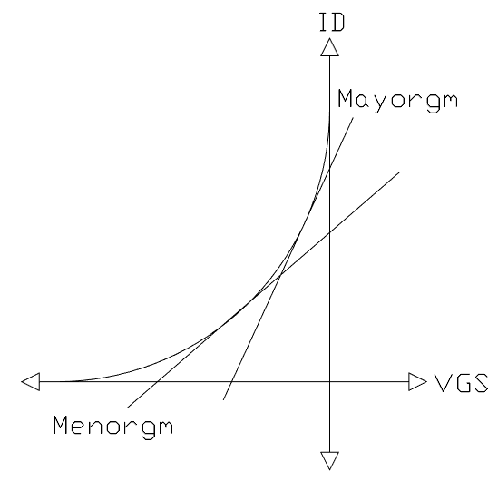 El valor de gm, es el valor de pendiente de la recta tangente a la transconductancia. Cuanto mas arriba estemos en la curva, mas pendiente habrá y por lo tanto mas gm.