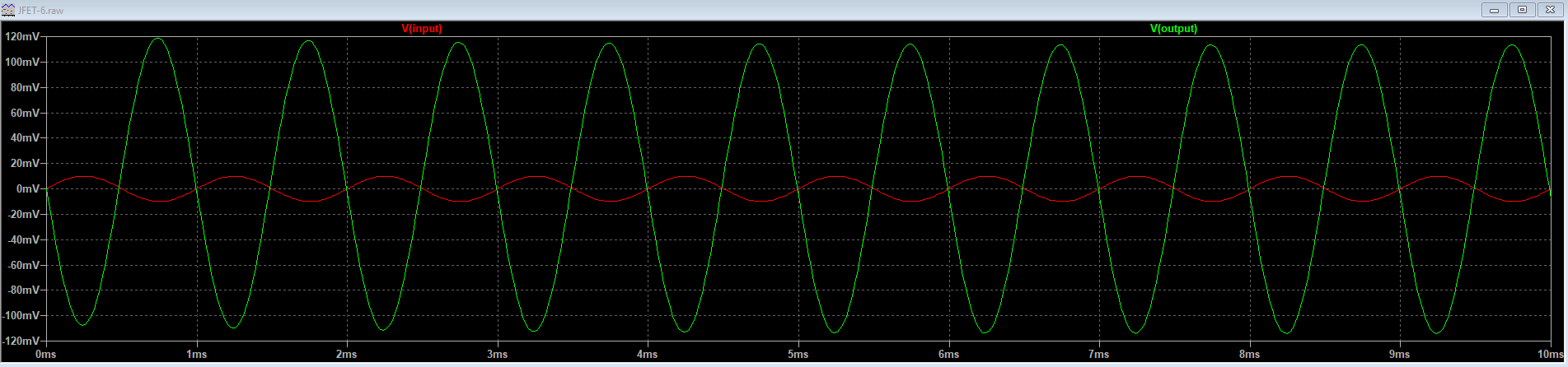 La salida debería ser por lo tanto ligeramente inferior a la que obtenemos (120 milivoltios). Esto es debido a que el datasheet da la gm mínima, que no se corresponde con la del modelo del simulador.