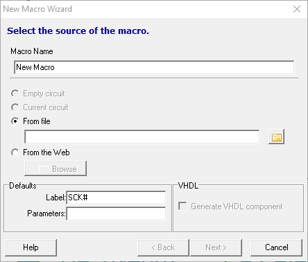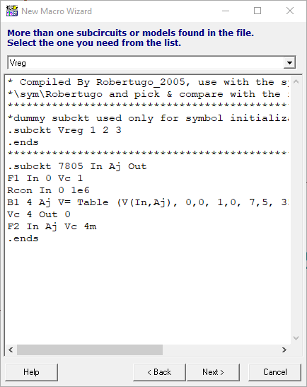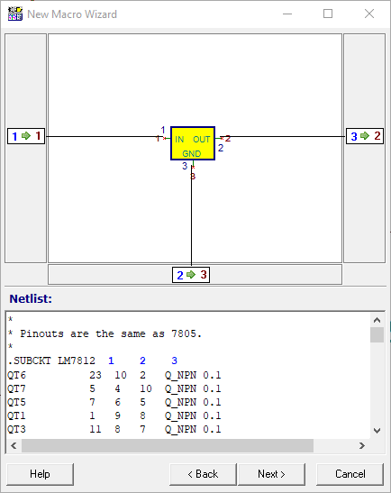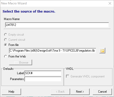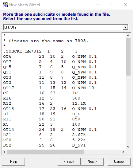 En la entrada Macro Name le introducimos el nombre de nuestro futuro bloque, ejemplo LM7812. En la casilla From file, buscamos el NetList de spice del modelo del 7812. Véase la siguiente imagen:
