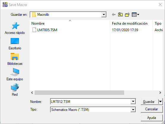 Elegimos el nombre de la macro, en este caso sería LM7812.TSM. Hacemos click en Guardar y ya tenemos nuestro modelo para Tina. 🙂