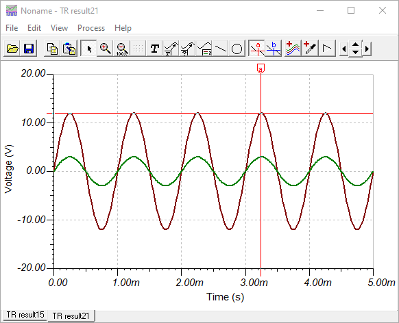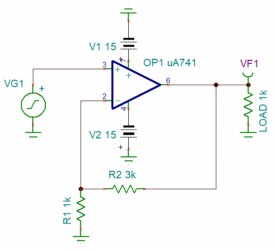 Veamos un ejemplo con un circuito de un amplificador operacional no inversor echo con Tina.