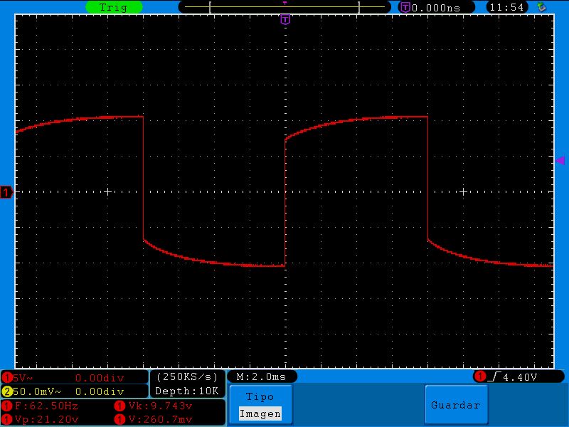 Vemos que la gráfica está deformada (la causa la veremos después). Sospecho en inicio que el problema puede venir del osciloscopio, que la sonda está descompensada. La ajusto según el manual y obtengo el mismo resultado.